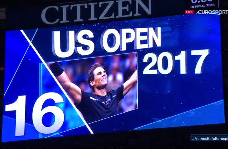 Momento de reconhecimento por parte da organização do US Open, após Rafael Nadal conquistar o seu 16.º título do Grand Slam. O número um mundial ainda aguardava pela cerimónia de prémios quando os ecrãs gigantes do Arthur Ashe Stadium passaram em revista todos os 16 momentos das grandes conquistas do espanhol.