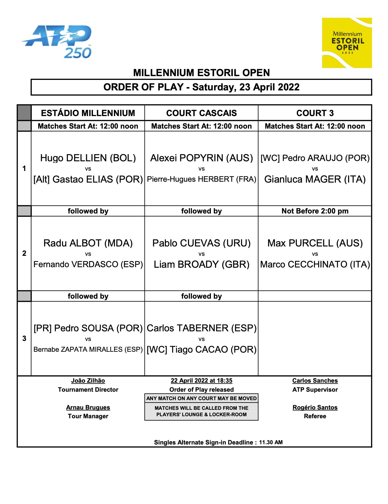 As maiores estrelas do circuito regressam aos courts do Clube de Ténis do Estoril e é neste sábado que se dá o tiro de partida: a programação do dia engloba os oito duelos que compõem a primeira eliminatória da fase de qualificação e quatro figuras lusas procuram a partir do meio-dia juntar-se a João Sousa e Nuno Borges no quadro principal: Gastão Elias, Pedro Sousa, Pedro Araújo e Tiago Cação.