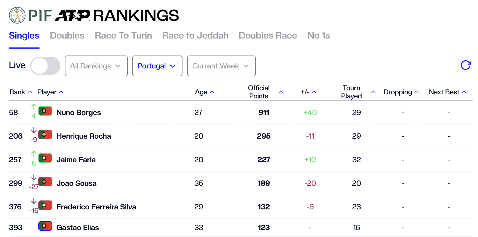 Esta alteração promoveu Jaime Faria a número três nacional. Depois de ter ganho quatro ITF M25 consecutivos e de ter passado o qualifying do Millennium Estoril Open, o jovem de 20 anos está no melhor ranking da carreira (257.º) e vinha a ganhar terreno ao ex-compatriota nos últimos meses, consumando desta forma uma ultrapassagem que já se antevia atendendo à forma de ambos.