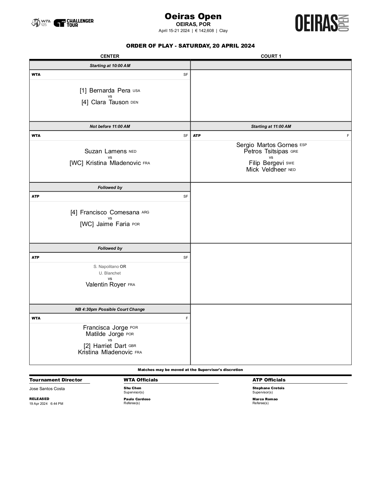Destaque, ainda, para a decisão de pares no Oeiras Open 125, o único embate sem honras de Court Central. O irmão mais novo de Stefanos Tsitsipas, Petros, um habitué nos torneios Challenger nacionais, aparece como um jogador mais mediático