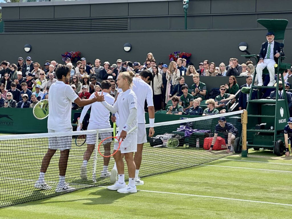 Mais curta foi a participação de Borges no quadro de pares. Quatro dias depois da eliminação em singulares, o melhor tenista português da atualidade perdeu ao lado do francês Arthur Rinderknech, ainda em jogo da primeira eliminatória, por 6-4 e 6-4 com os britânicos Arthur Fery e Charles Broom, que revelaram mais aptidão para o ténis em relva. O duelo foi interrompido na sexta-feira quando a dupla da casa tinha acabado de arrecadar a primeira partida, mas este sábado foram Borges e Rinderknech a começar melhor para liderarem o segundo set por 2-0 antes da chuva voltar.