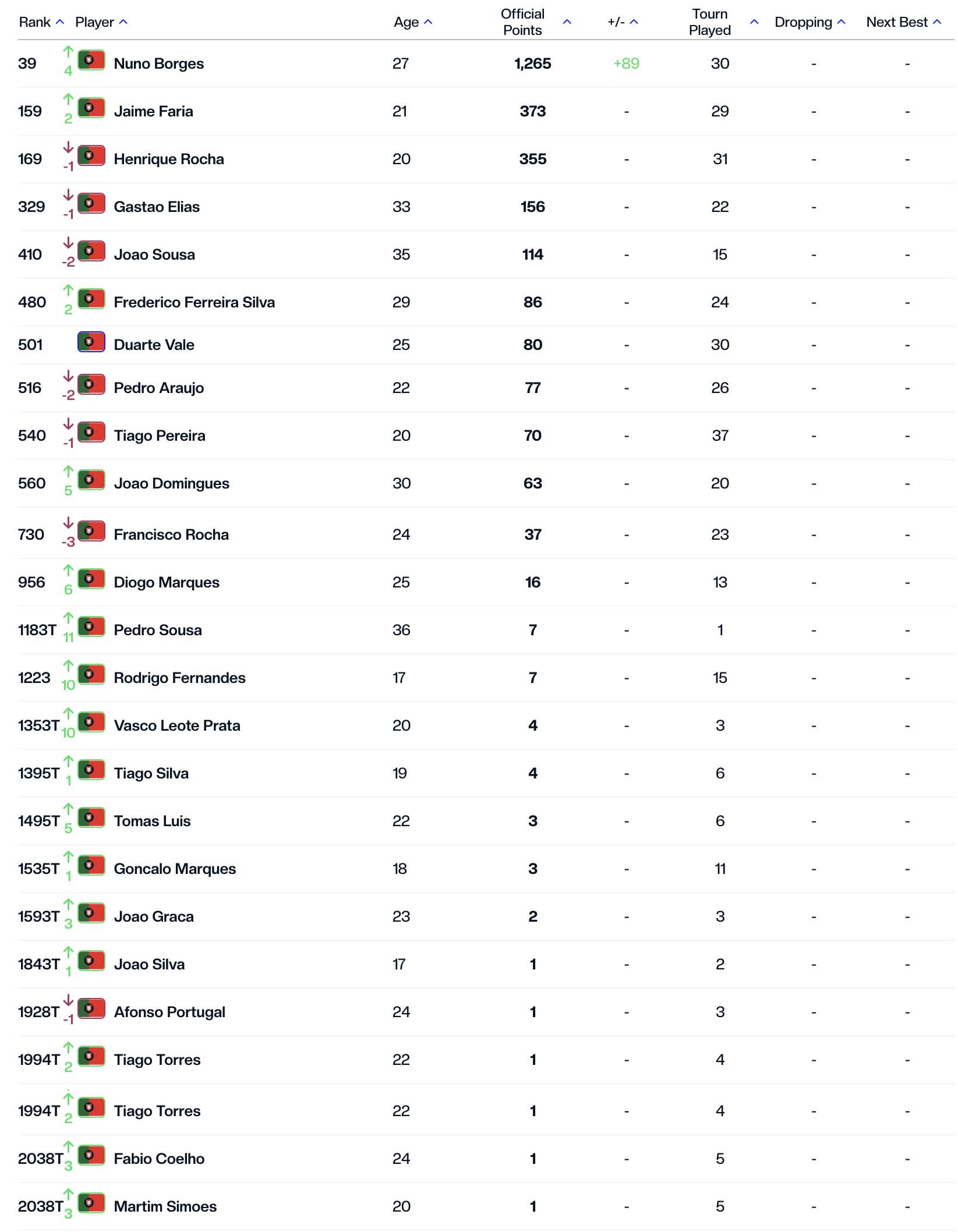 De resto, as únicas movimentações ascendentes no top 10 nacional prendem-se com as subidas ligeiras de Frederico Silva (480.º com um ganho de duas posições) e João Domingues (560.º ao subir cinco degraus).