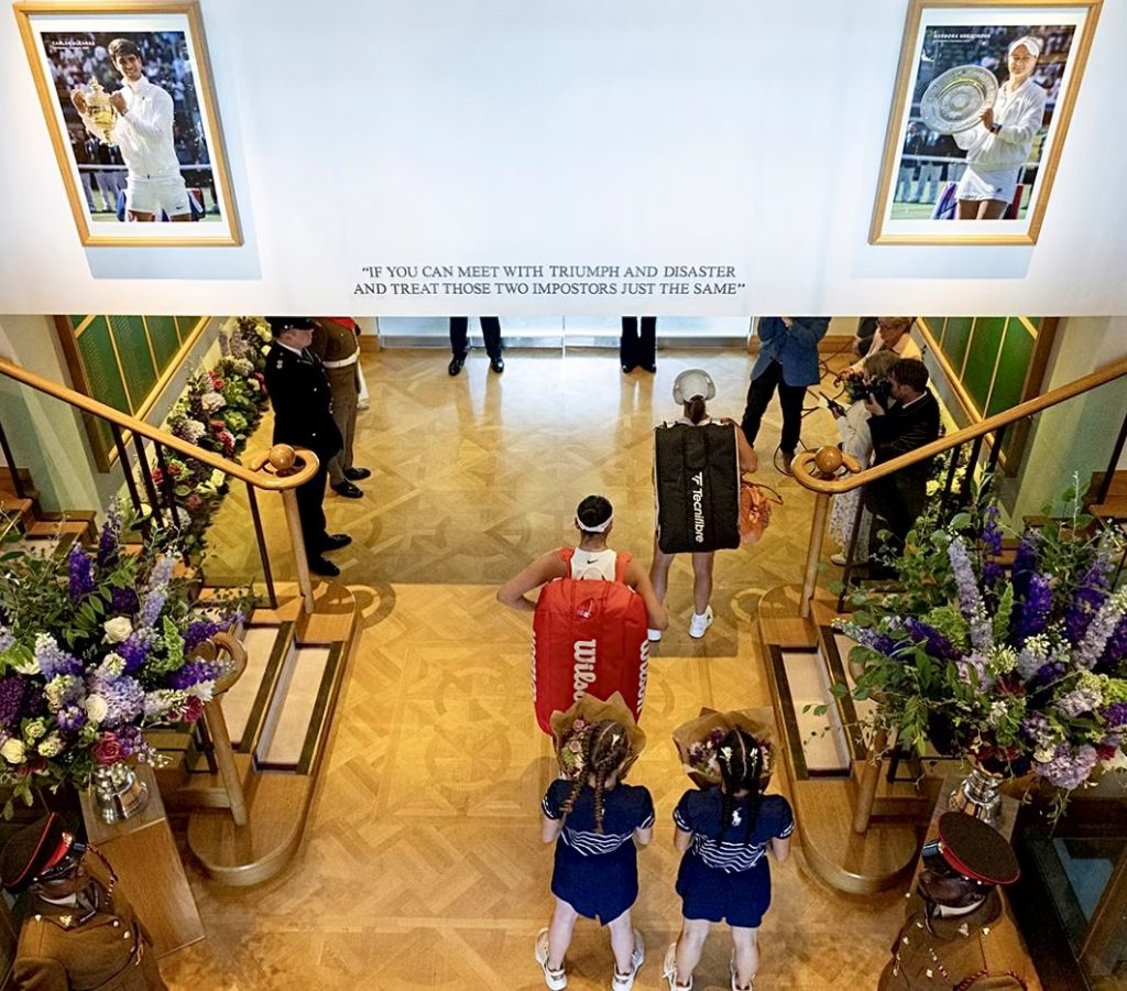 Aquela que, para mim, foi a fotografia do torneio não foi tirada durante ou depois das finais individuais do fim-de-semana — foi tirada antes da final de singulares senhoras, quando Iga Swiatek e Amanda Anisimova estavam na antecâmara que dá acesso ao Centre Court e esperavam ser anunciadas para entrarem no mais prestigiado court do planeta. Por cima delas, na parede, está a lendária inscrição tão associada à história de Wimbledon e que é uma estrofe que faz parte do poema ‘If’, de Rudyard Kipling: