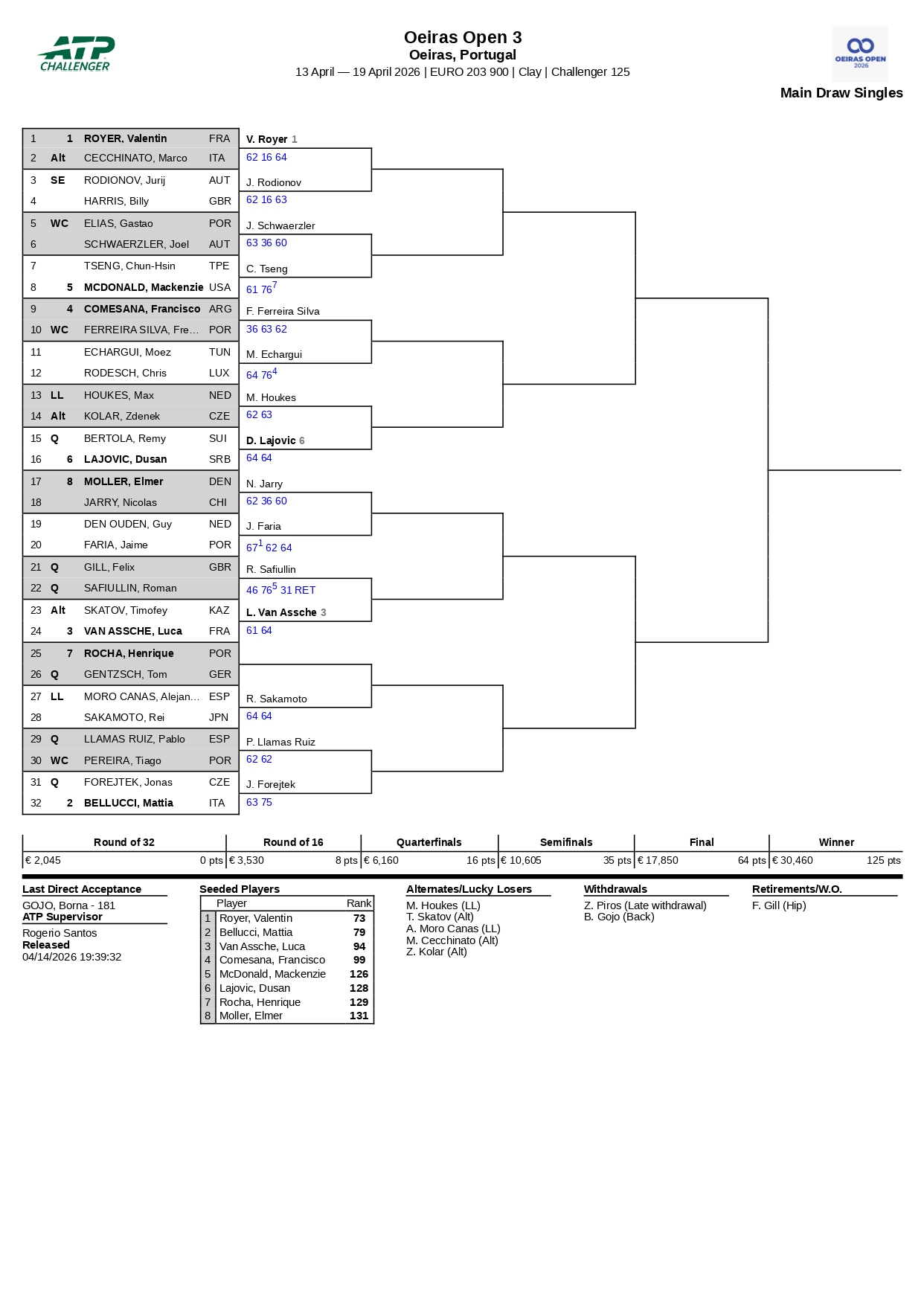 O sexto cabeça de série Dusan Lajovic (impôs num duelo de esquerdas a uma mão contra Remy Bertola), Jurij Rodionov e o lucky loser Max Houkes foram os restantes felizardos da jornada.