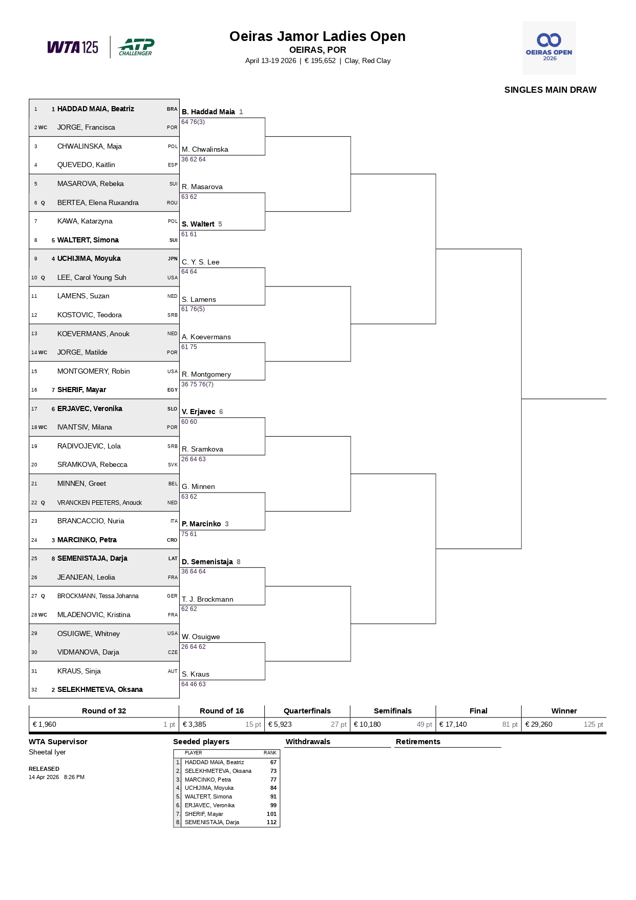 A maior surpresa da jornada surgiu com a derrota de outra tenista de elite, a japoensa Moyuka Uchiima (86.ª), quarta pré-designada, que viu Carol Young Suh Lee (169.ª, vinda do qualifying) prevalecer com os parciais de 6-4 e 6-4. De resto, a ex-top 60 Greet Minnen, várias vezes feliz por Portugal, e a ex-número um júnior Whitney Osuigwe (superou a checa Darja Vidmanova, vice-campeã do primeiro WTA 125 da época nacional) também avançaram no quadro.